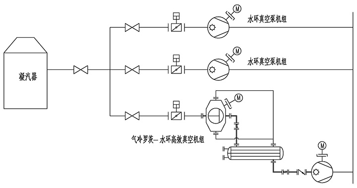 具體的思路為,不改變?cè)b置中的水環(huán)式抽真空系統(tǒng)的設(shè)備及功能,在抽真空主管道上并接一套羅茨水環(huán)高效真空機(jī)組。在機(jī)組啟動(dòng)建立真空期間,首先由原裝置水環(huán)式抽真空系統(tǒng)進(jìn)行快速預(yù)抽,以達(dá)到啟動(dòng)真空,在正常運(yùn)行保持真空階段,使用羅茨水環(huán)高效真空機(jī)組進(jìn)行維持真空。
