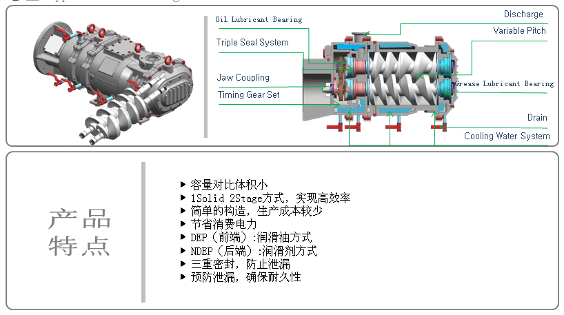 l  泵體內(nèi)僅兩個(gè)螺桿轉(zhuǎn)子運(yùn)轉(zhuǎn),螺桿之間及螺桿與泵體之間無接觸
