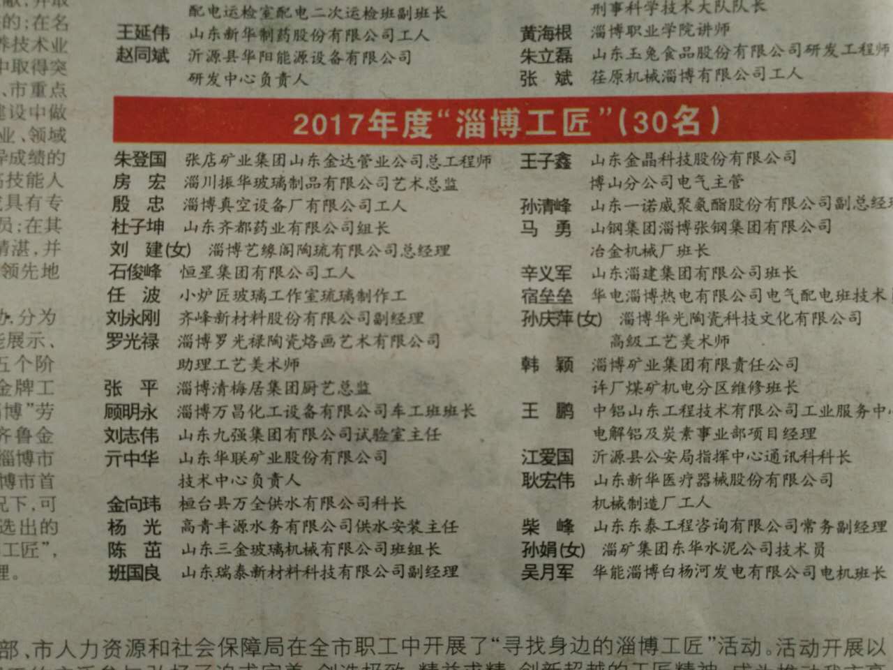 公司一名員工榮獲“淄博工匠”、三名員工榮獲“博山工匠”稱號(hào)